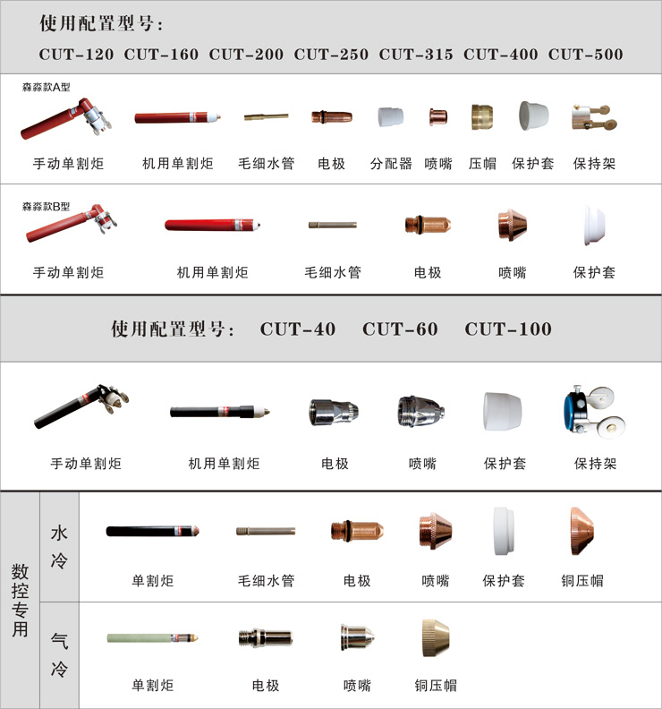 注○3:CUT-315型以上配件,制造結(jié)構(gòu)獨(dú)特,電極采用“全方位”水冷卻,噴嘴采用“增壓式”,與其他型號配件不能互用,選用時(shí)務(wù)必請注明型號。